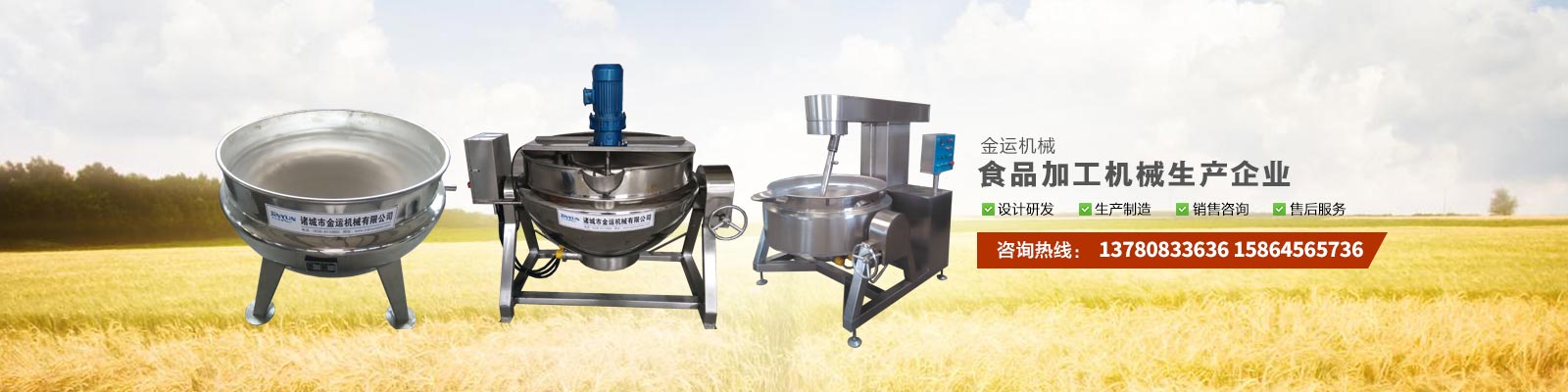 主要產品有:行星攪拌夾層鍋、夾層鍋、壓力煮鍋、各種餡料炒鍋、殺菌鍋(殺菌釜)、巴氏殺菌機、清洗流水線、風干線、真空包裝機、滾揉機、斬拌機、鹽水注射機、大蒜脫皮機、大蒜分瓣機等,廣泛應用于各種食品加工、食品殺菌及農產品深加工、化工、醫(yī)藥的生產等。可滿足外資企業、合資企業及國內大中小企業生產需求,產品暢銷全國各地。
